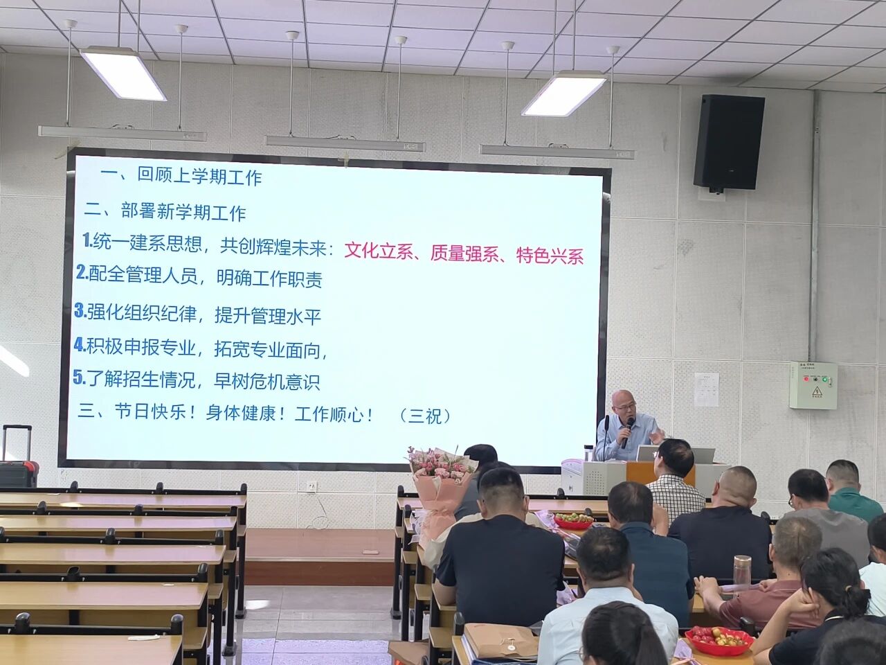 9月10日,恰逢第41个教师节,中文系在明志楼106阶梯教室召开2025年秋季学期开学工作大会。会议由中文系负责人张兴旺主持。一句句问候语、一盘盘鲜水果,一束束康乃馨,营造出浓浓的节日氛围。老师们同聚一堂,共话新学期工作。